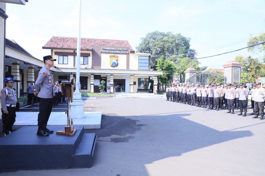 Apel dipimpin oleh Wakapolres Kediri Kota, Kompol Putu Gde Caka Pratyaksa Ratsuko, S.I.K., M.I.K., dan diikuti oleh jajaran pejabat utama, para kasat, kasi, kapolsek, serta seluruh personel Polres Kediri Kota.