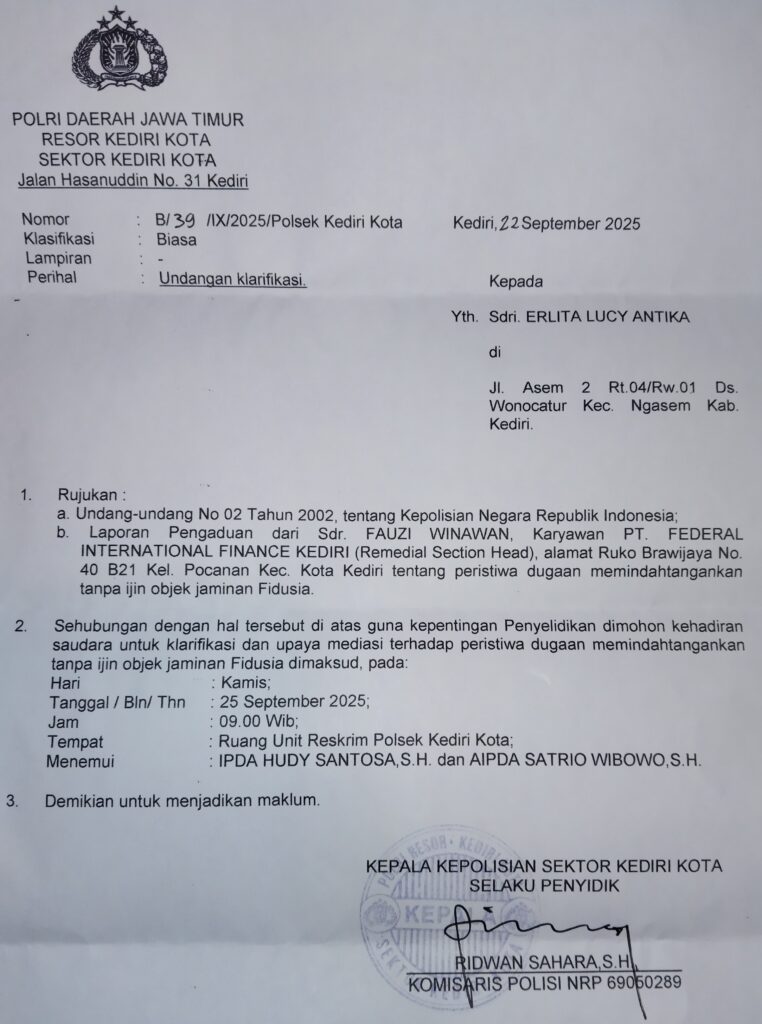 Kediri, Krisnanewstv.com – Polemik antara debitur dengan pihak leasing kembali mencuat di Kediri. Seorang debitur, Erlita Lucy Antika, mendapat undangan klarifikasi dari Kepolisian Sektor Kediri Kota terkait aduan yang dilayangkan oleh Fauzi Winawan, karyawan PT. Federal International Finance (FIF) Kediri.