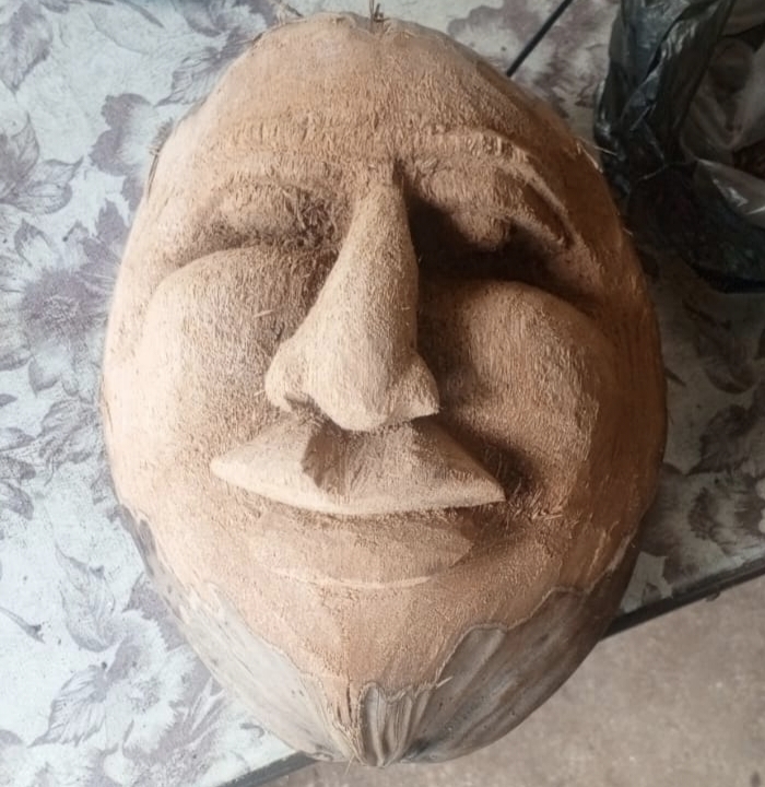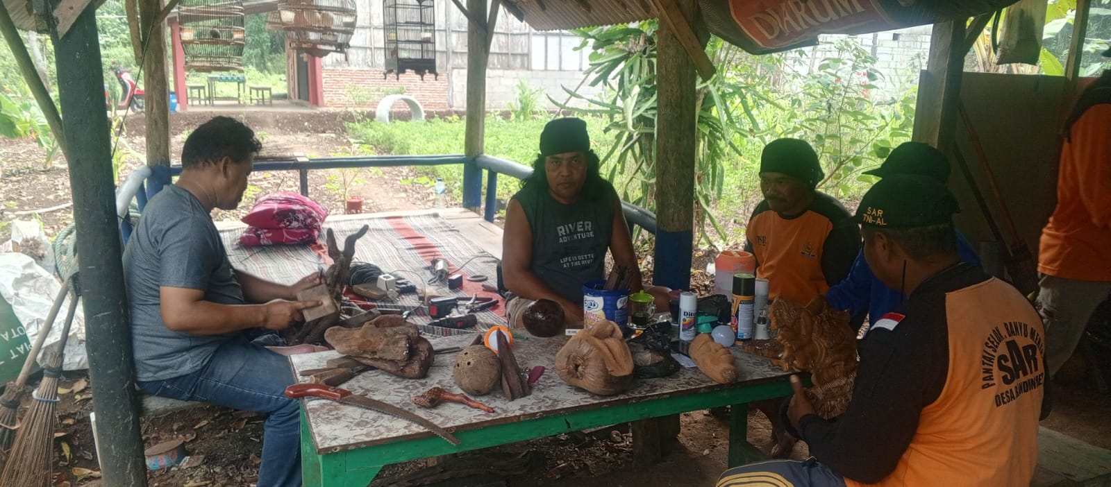 “Biasanya kelapa gabut dan kayu kami bakar, sekarang kami jadikan topeng, patung burung, dan banyak lagi. Semua kami buat langsung tanpa sketsa. Ini jadi tempat belajar dan berkarya bersama,” tutur mereka.