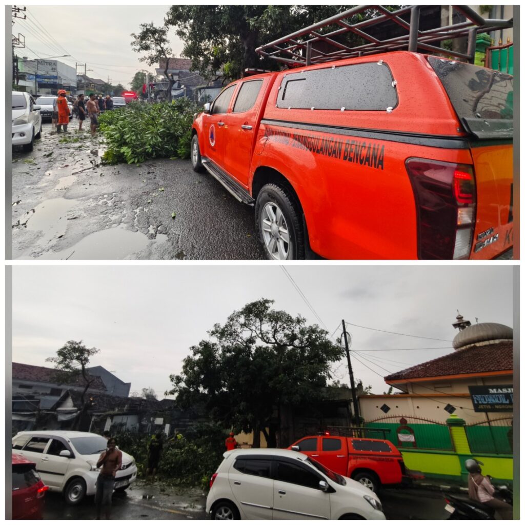Badan Penanggulangan Bencana Daerah (BPBD) Kota Kediri bersama masyarakat setempat langsung melakukan evakuasi pohon tumbang di berbagai titik.