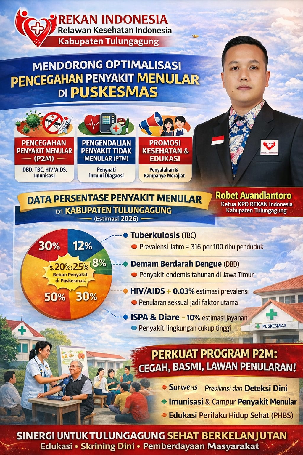 TULUNGAGUNG, Krisnanewstv.com — Ketua KPD Rekan Indonesia Kabupaten Tulungagung, Robet Avandiantoro, mendorong Dinas Kesehatan Kabupaten Tulungagung untuk memperkuat peran Puskesmas dalam upaya pencegahan penyakit melalui pendekatan promotif dan preventif kepada masyarakat.
