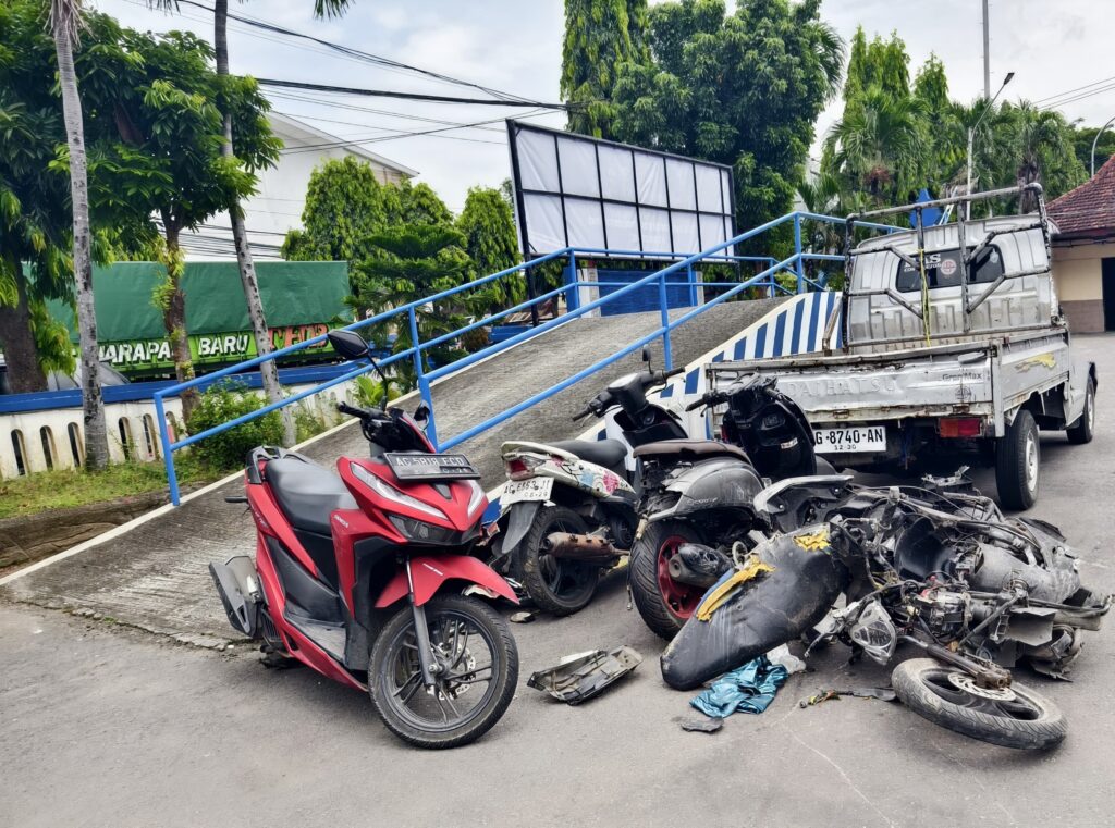 AG 7662 OT dengan Mobil Xenia nopol AG 1925 OT dan lima pengendara sepeda motor yakni Honda Vario nopol AG 2257 DA, Honda Scoopy AG 4798 OH, Yamaha AG 6863 VI, Yamaha NMAX AG 2528 AAC, dan Honda Vario AG 5818 ECD