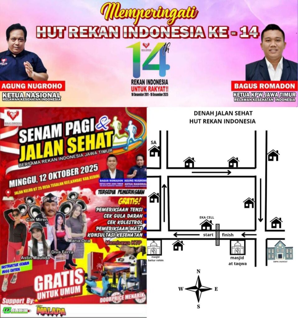 Kediri, Krisnanewstv.com — Dalam rangka mempererat silaturahmi antar relawan dan masyarakat, Relawan Kesehatan Indonesia (Rekan Indonesia) Jawa Timur akan menggelar kegiatan Senam Sehat dan Jalan Santai pada Minggu, 12 Oktober 2025, bertempat di Kantor Sekretariat Rekan Indonesia Kabupaten Kediri, Jalan Kelud RT 25, Desa Tegalan, Kecamatan Kandat, Kabupaten Kediri.